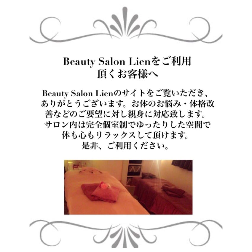 Beauty Salon Lien大網駅から徒歩10分10:00~20:00大網白里市の完全個室プライベートサロン。20,000人以上の実績を持つセラピストが、琥珀配合ヒートジェルと独自のリンパ手技でセルライト・むくみを集中ケア。体質改善を重視したオーダーメイド痩身とブライダルケアで持続する結果を目指します。料金(税込)2,750円〜詳細を見る公式サイトを見るプラン1回あたり(税込)総額(税込)回数期間回数券リンパドレナージュ 20分¥2,750/回¥2,7501回-他14件のプランを見る