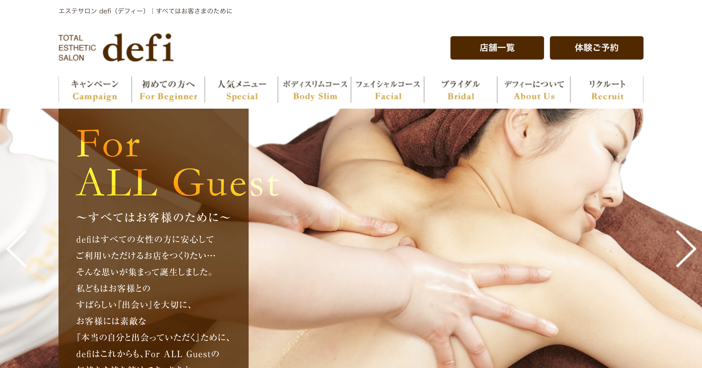 e-defi 福岡天神店西鉄福岡(天神)駅から徒歩5分全日 10:00~19:00ハンドケア主体の独自技術で体質・肌質に合わせたオーダーメイド痩身&ボディケアを提供。CIDESCO等の国際資格保有者が多数在籍し、結果重視のメニューを50種類以上揃える福岡天神の老舗サロン。料金(税込) -詳細を見る公式サイトを見るプラン1回あたり(税込)総額(税込)回数期間要問合せエステ体験-¥1,990--他5件のプランを見る