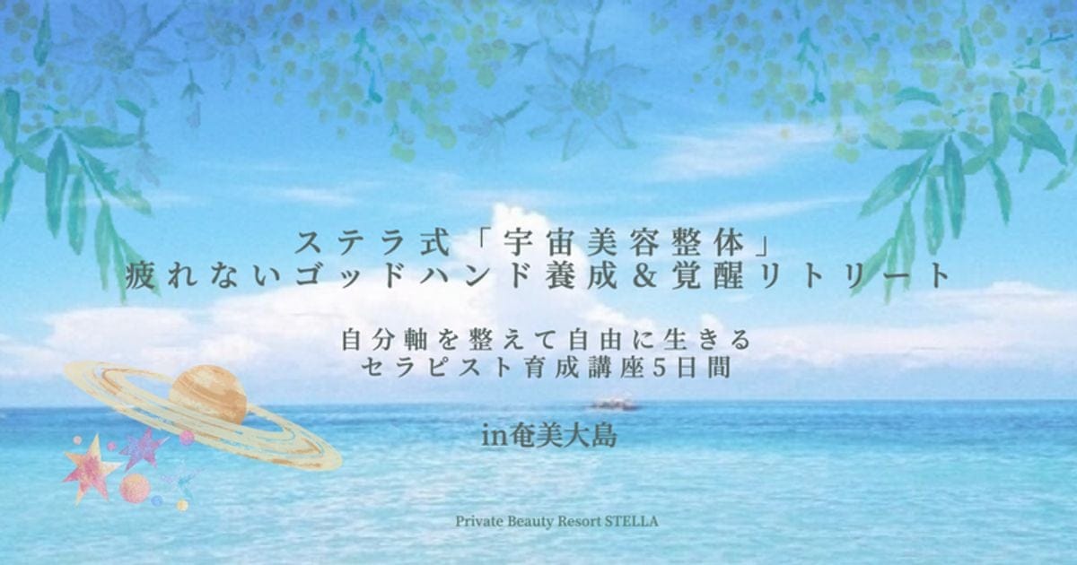 Private Beauty Resort STELLA奄美大島を拠点とするPrivate Beauty Resort STELLAは、シンギングボウルと美容整体を融合した独自メソッドでセラピストを育成するリトリート型スクール。実技中心の奄美リトリートとオンラインで技術・集客まで伴走サポートします。料金(税込) -詳細を見る公式サイトを見るプラン1回あたり(税込)総額(税込)回数期間要問合せSTELLA式セラピスト養成講座(3ステップ)-¥298,000--