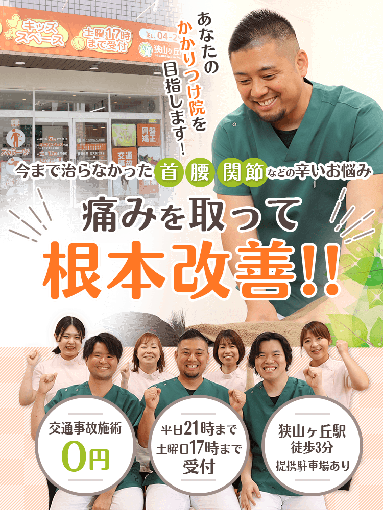おいかわ整骨院狭山ヶ丘駅から徒歩3分平日 10:00~13:00, 15:00~21:00 / 土曜 10:00~13:00, 15:00~17:00 / 日祝 休診姿勢検査で原因を特定し、トムソンベッドと楽トレ(寝ながらのインナーマッスル強化)を組み合わせて骨盤・姿勢を根本改善。産後は無料託児で子連れでも通いやすく、平日夜21時まで受付で通勤帰りにも便利です。料金(税込)3,500円〜詳細を見る公式サイトを見るプラン1回あたり(税込)総額(税込)回数期間都度払いインナーマッスルトレーニングコース(楽トレ)¥3,500/回---他4件のプランを見る